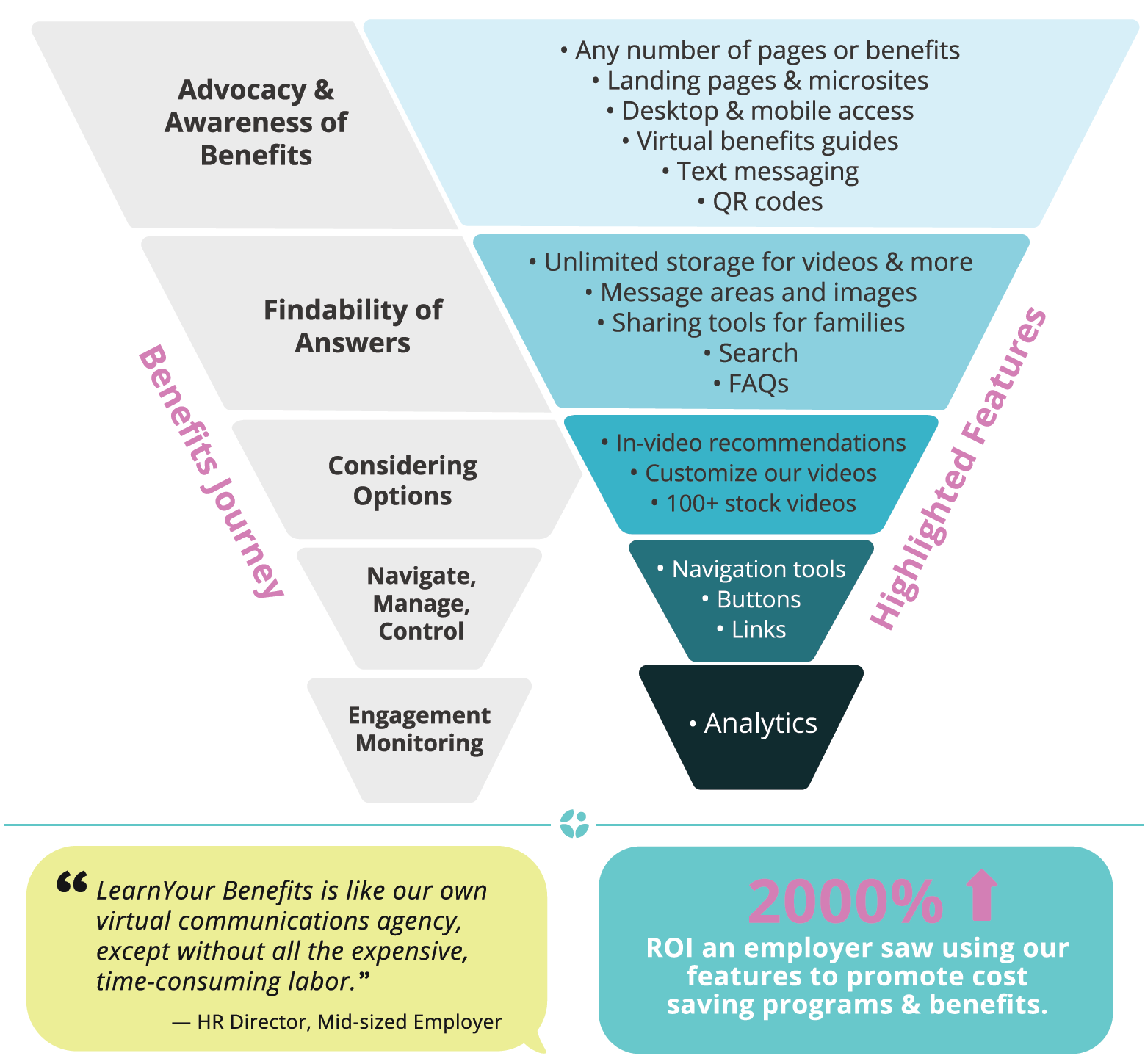 LearnYour Benefits is effortless to customize for any benefit or promotional need, plus our teams will do the heavy lifting during implementation, open enrollment prep, on-going programs, and optimizations.